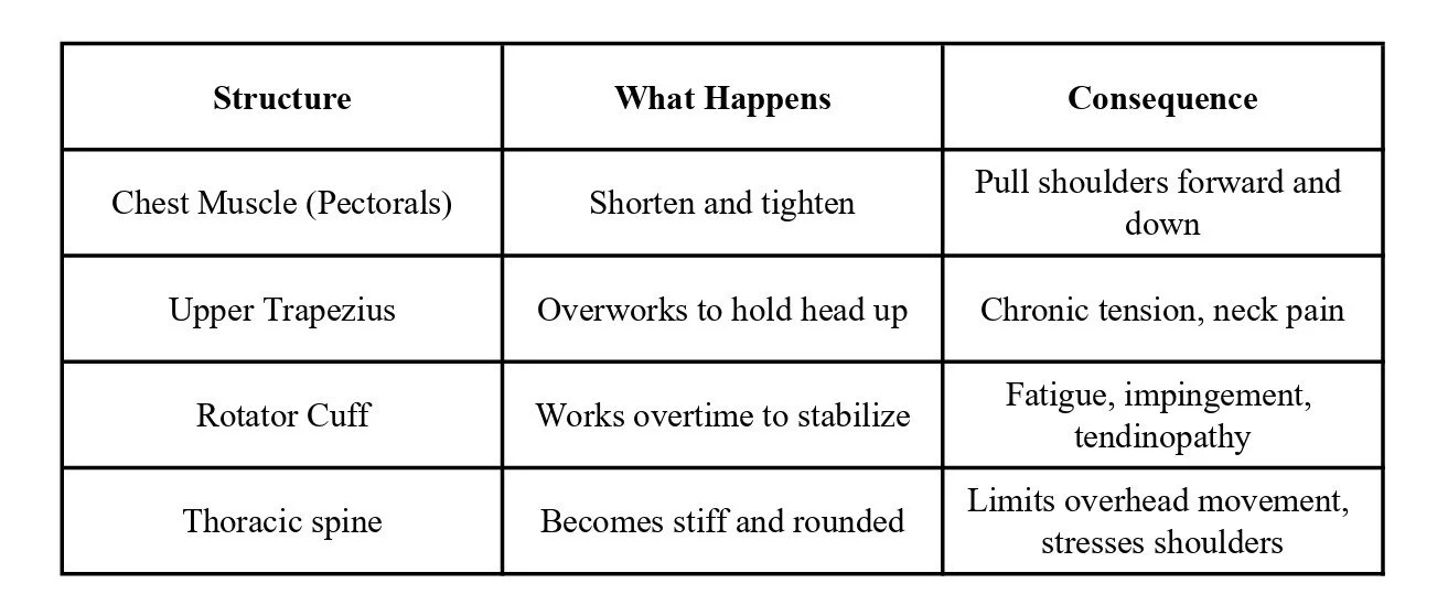 Your shoulder wasn't designed for hours of sustained forward reaching. When we sit at computers, scroll on phones, or hunch over laptops, we place our shoulders in a compromised position for extended periods. Overtime, this leads to predictable patterns of muscle imbalance and joint stress.